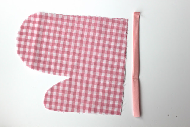 Cut 2 pieces of bias tape measuring 8 1/2 inches long. You want them to be just slightly longer than the width of your oven mitt fabric.