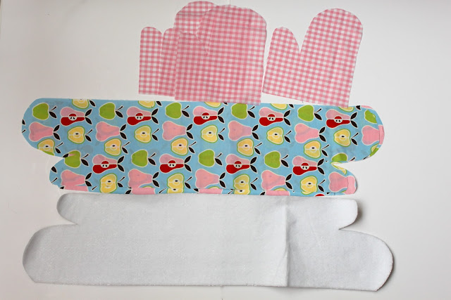 First, cut mitt shapes out of the ends of both long pieces of fabric and insul-bright. Cut a mitt shape out of one 8 inch side for the 4 pieces of mitt fabric as well. I just free-handed this by tracing the outline of an oven mitt and adding a 1/2 inch for a seam allowance!!
