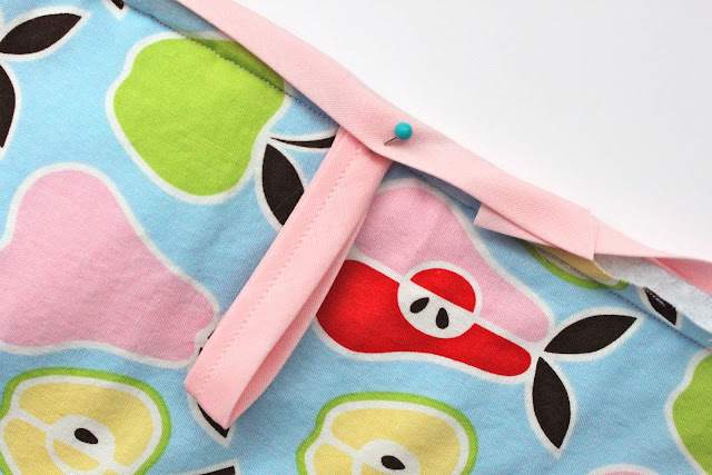 Pin the hook underneath your pinned bias tape before you start to sew it down. Then, go ahead and start sewing that bias tape down. All the way around, being sure to go slow around the curves!!